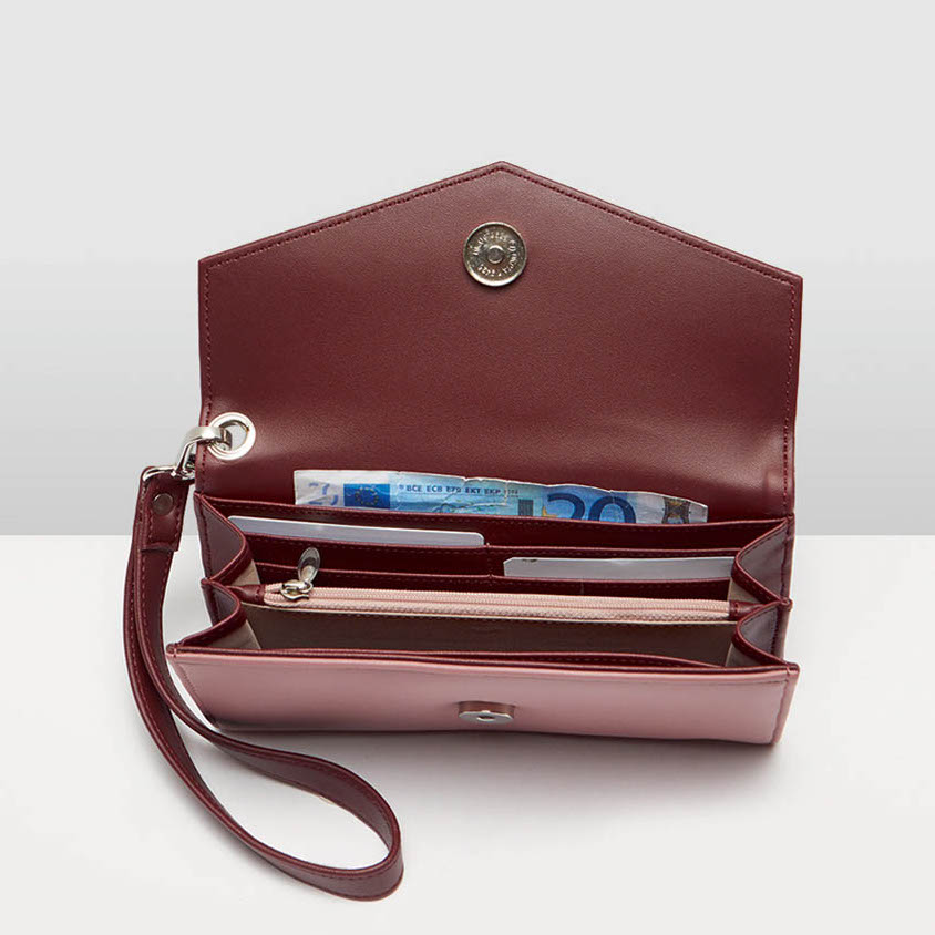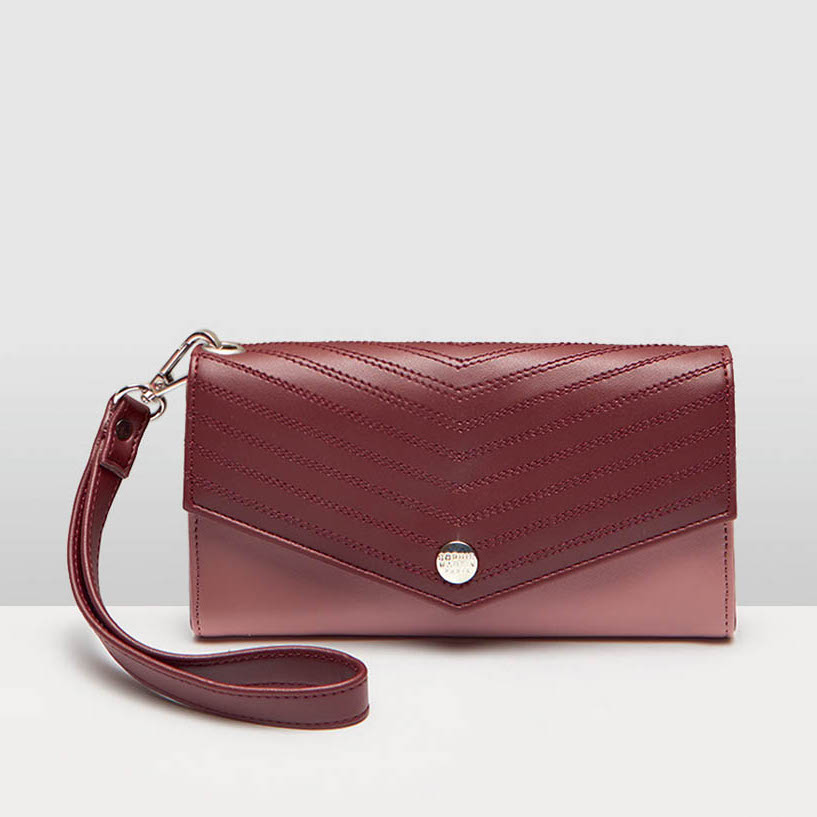 Dompet wanita dari SOPHIE MARTIN PARIS dengan menggunakan bahan kulit sintetis berwarna burgundy berukuran 12 x 2 x 9cm memiliki 1 kantong uang kertas, 2 kantong serbaguna, 6 kantong kartu.